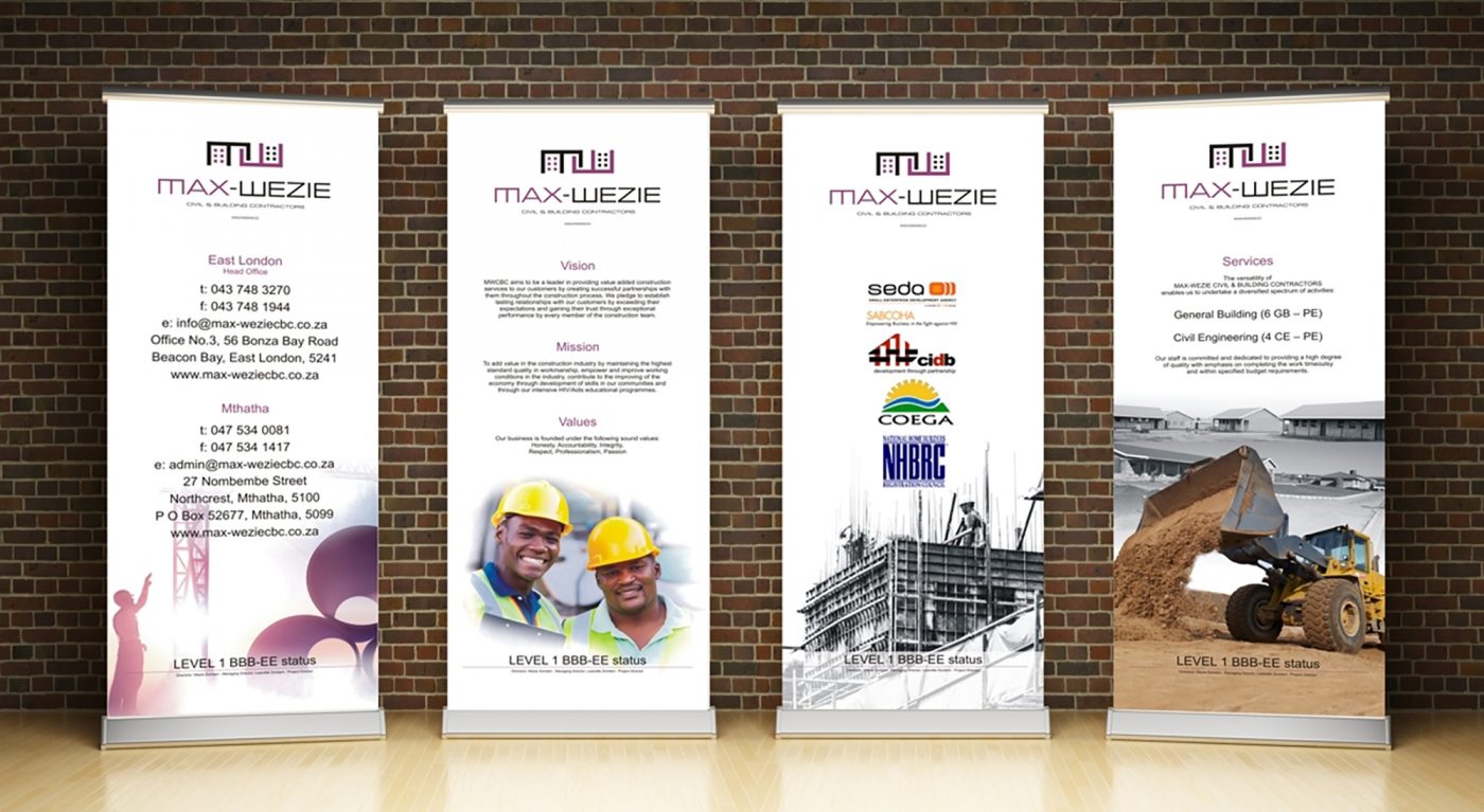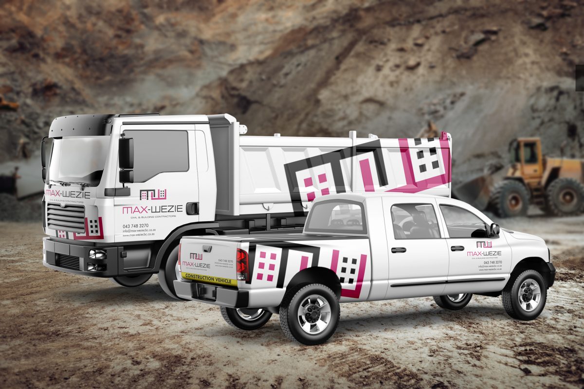 Husband and wife team, Max and Wezie were looking to rebrand their successful construction business. The logo is made up of the M and W interlinked, which reflects their partnership in life and work. The logo had to be simple, timeless and eye-catching. As Max-Wezie has a massive fleet of vehicles that needed to be branded, the colours were chosen according to the vinyl readily available to signage companies in order to facilitate speedy repairs when signage is damaged. Their vehicles have to be neat and orderly at all times due to their ongoing contracts with large parastatals and government departments.